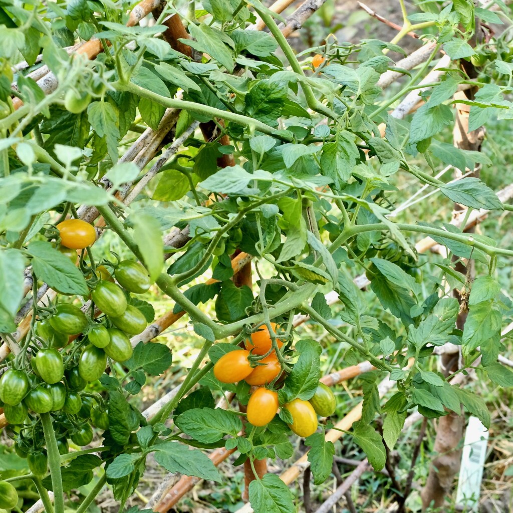 die üppig bewachsenen Beete gut erkennen. Entlang des Zaunes wachsen Beeren,
